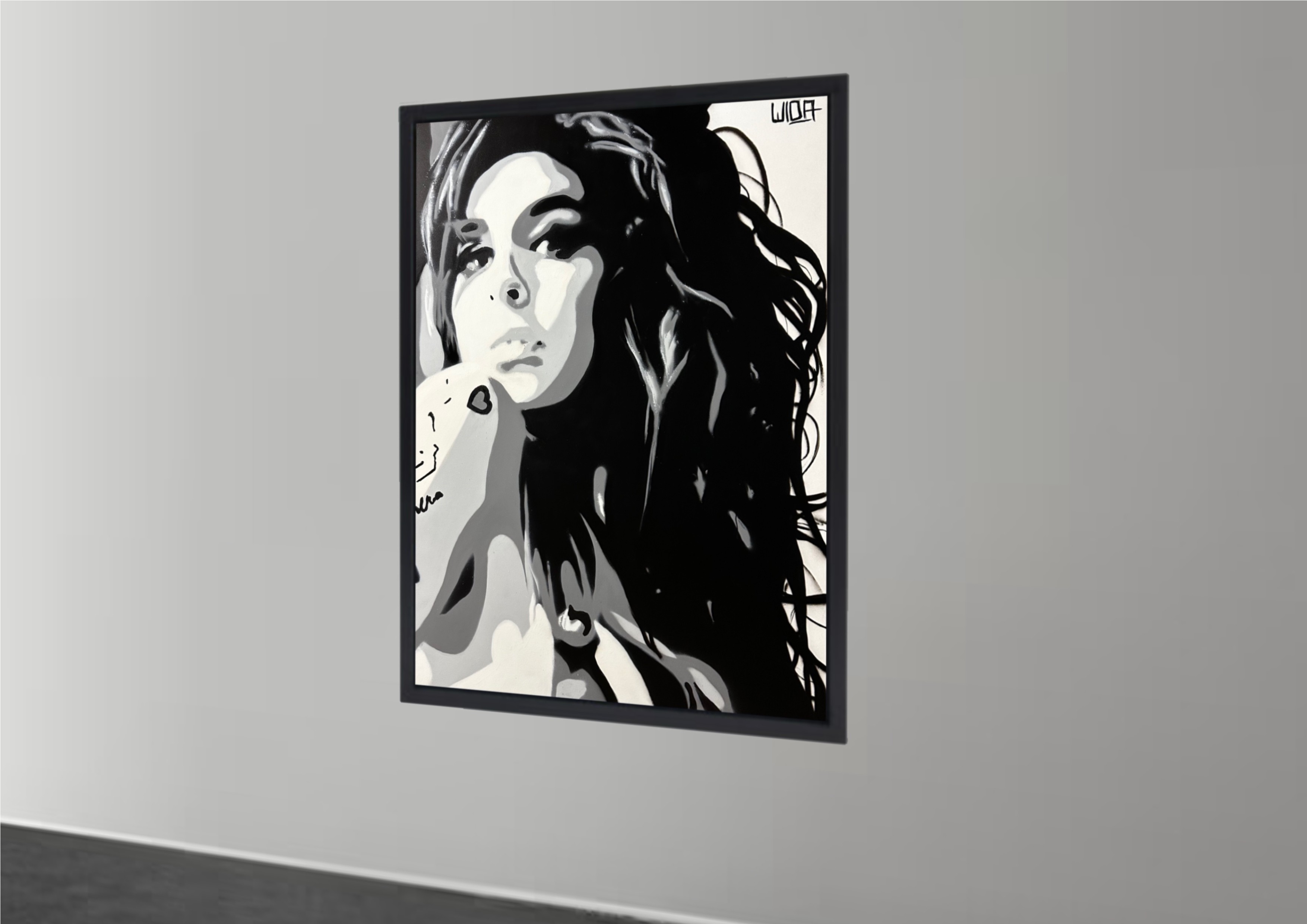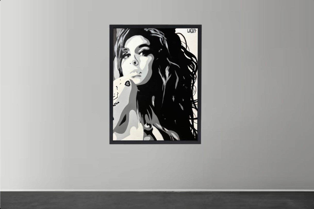 Diese gemalte Leinwand zeigt eine moderne, künstlerische Interpretation von Amy Winehouse im Pop-Art-Stil, vollständig umgesetzt in Grautönen. Der Fokus liegt klar auf dem ausdrucksstarken Portrait, das Charakter, Attitüde und Präsenz der Künstlerin in einer reduzierten, zeitgemäßen Bildsprache einfängt.